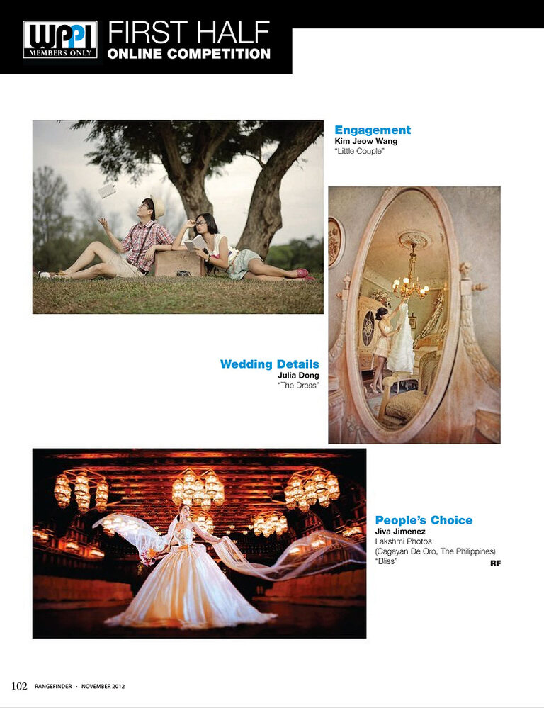 Exciting news: Both Danny & Julia have won 1st place awards in 2012 WPPI first half online competition. We are so honored to be featured on the November issue of Rangefinder Magazine with the award winning images: