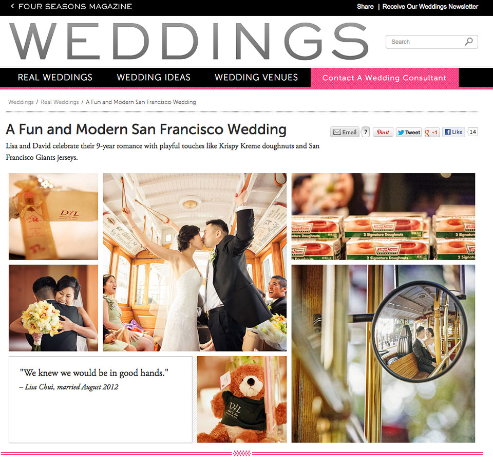 Very excited to see Lisa & David ‘s wedding featured on Four Seasons Magazine. Can’t wait to see the printed version coming out soon. Here is the online version: https://magazine.fourseasons.com/weddings/real-weddings/a-fun-and-modern-san-francisco-wedding We are very honored to cover their beautiful wedding on 8/18/2012 at San Francisco Four Seasons Hotel. And here are some screen shots from...